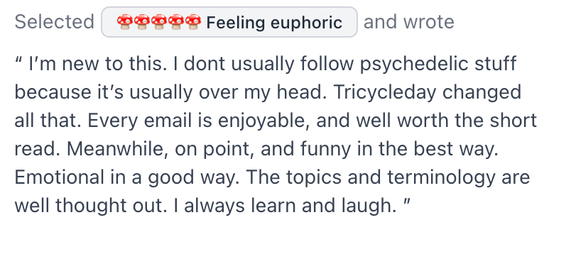 Welcome to Tricycle Day. We’re the psychedelics newsletter that comes with all sorts of perks and benefits. Okay, we may not cover your insurance, but who needs health care when you have memes? 🥲
